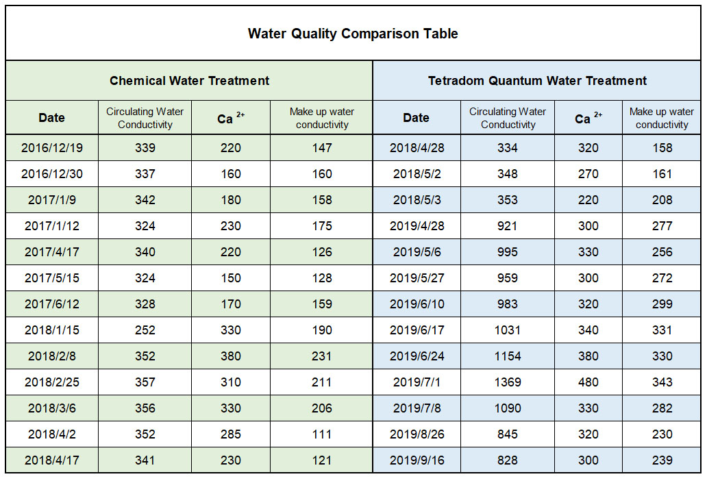 特拉多姆圆环形水处理器装置安装于循环冷却水系统的两条支管上,自2006年7月投入运行,持续使用17个月直至2007年11月。期间因系统停机检修曾中断生产四个月,实际运行时间为14个月。