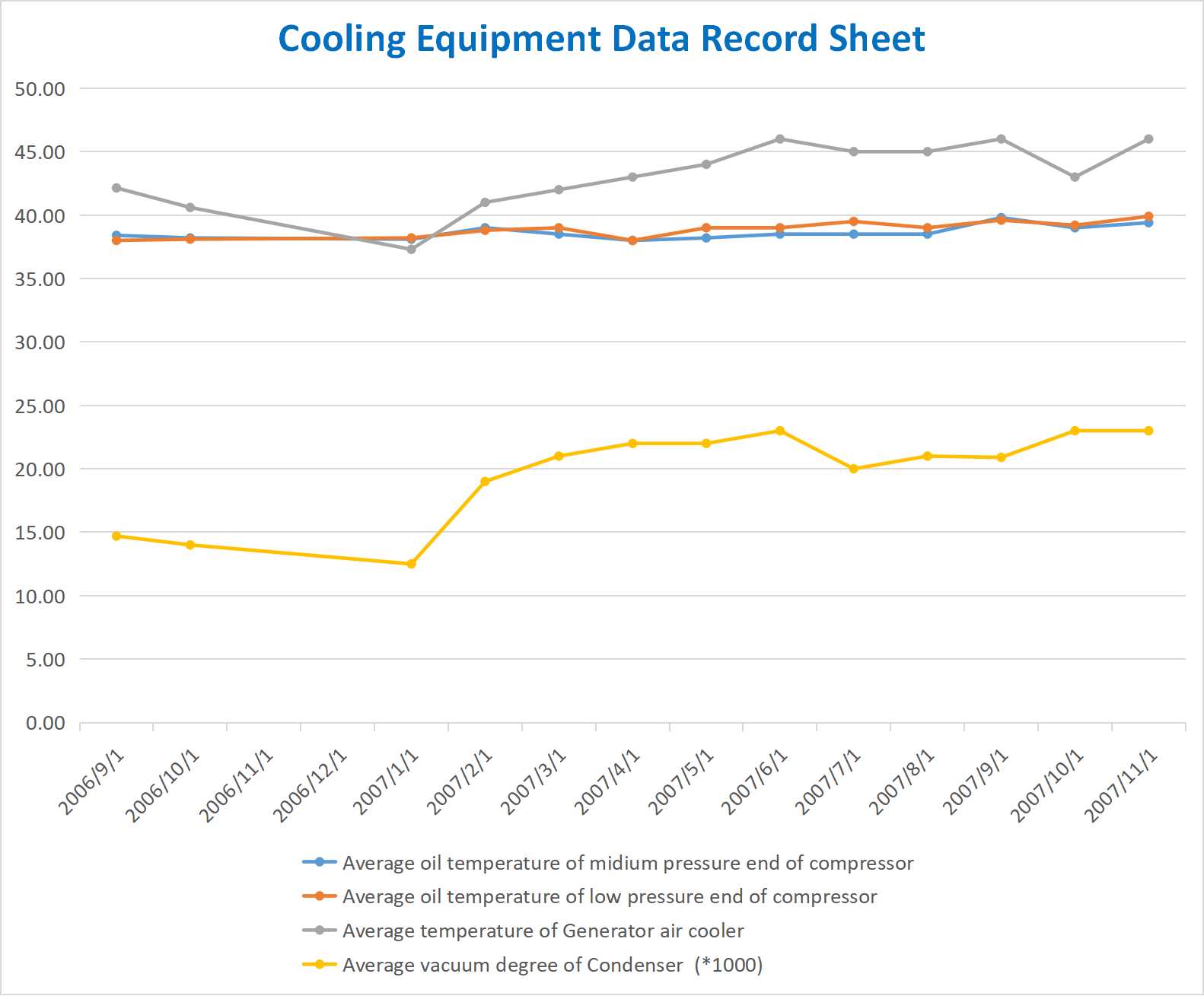 2.设备冷却效果符合预期参数。涡轮机油温与发电机空气冷却器温度均处于规定控制范围内。以下为冷却设备监测数据: