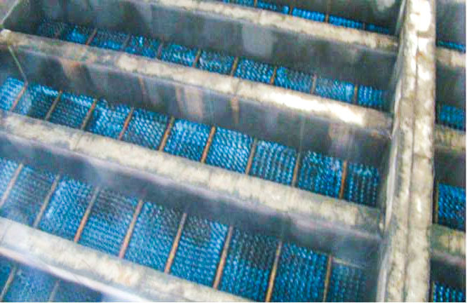 请打开冷凝器前室,观察入口端管板及其管道是否存在污垢沉积或腐蚀现象。热管的金属光泽端面清晰可见。需注意:出口端管板及其冷却管上可见少量生物性粘液,同时金属表面清晰可见。该粘液由细菌和藻类形成,轻触即可清除。清除后,管道内壁将显露出金属光泽表面。与2017年同期现场拍摄的图像相比,当前状态已显著改善。
