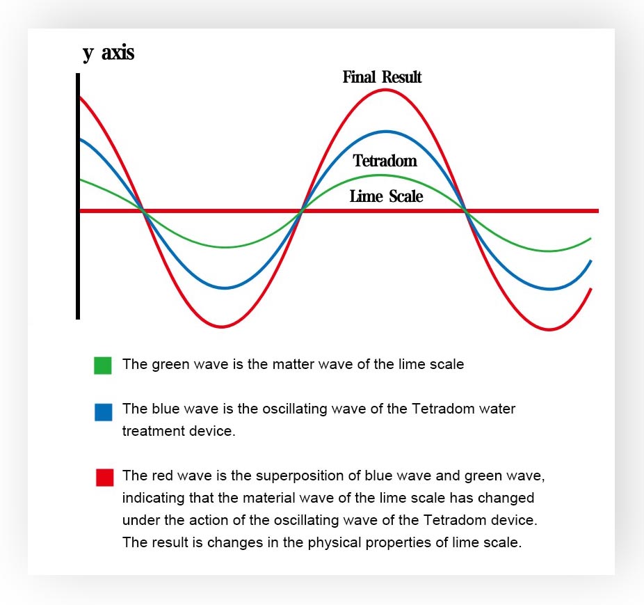 特拉多姆产品通过振荡波逐步分解水垢,使其松动脱落,并随水流冲走。经处理的水改变了形成水垢的盐分子物理特性,从而防止其重新结垢。