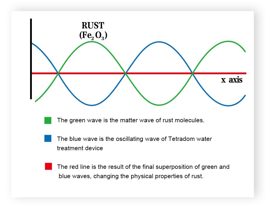 介电材料将预先记录的超精细振动波传导至介质(如水、油),使其产生微共振。随后,通过介质的振动,改变其周围各类无机物与有机物的物质波振幅,从而改变其分子间的结合形态。具体表现为:水垢结构松动、氧化铁锈分解脱落、细菌藻类生命物质减少。