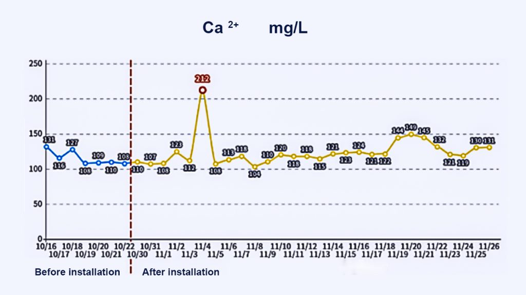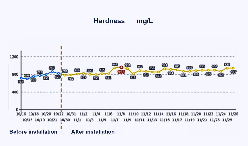 特拉多姆水处理产品对长期沉积的水垢具有卓越清除效果。铁离子与钙离子浓度上升源于水垢在水中的溶解。尽管水硬度增加,系统未形成新水垢且运行正常,这表明特拉多姆水处理产品能改变循环水的浓度比。