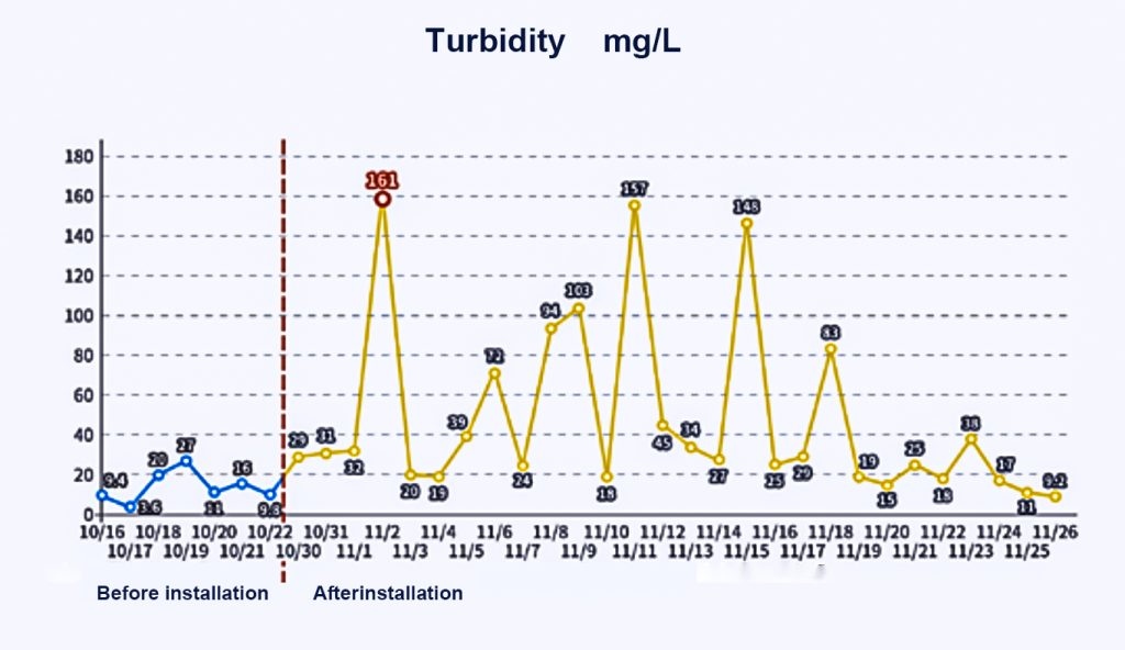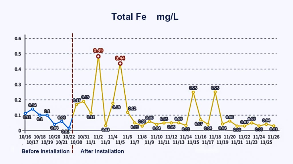 安装特拉多姆水处理设备后,通过实验室分析监测了浊度、总硬度、钙离子、铁离子等数据变化。浓度倍数变化表明:设备安装后,管壁形成的垢层与锈蚀开始剥离,通过溶解过程融入循环水体。导致堵塞的沉积物已被清除,系统现已恢复正常运行。